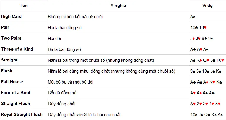 Trong poker, mỗi ván bài sẽ có những tổ hợp bài cụ thể và thứ tự ưu tiên của chúng. Dưới đây là một số ví dụ: