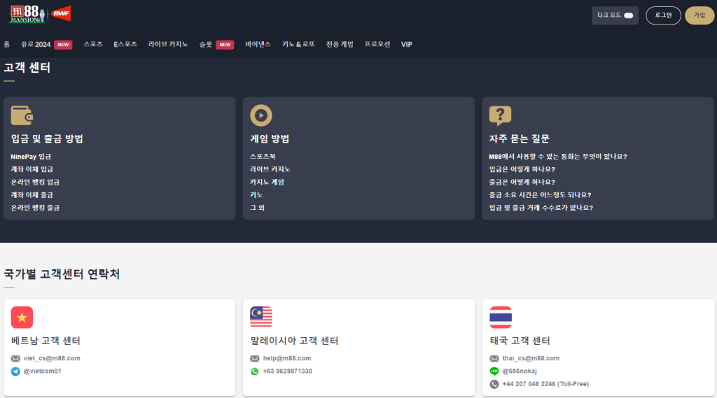 M88는 2003년부터 공식적으로 운영된 아시아 최고의 온라인 베팅 사이트로서 신뢰받는 브랜드입니다. 현재 M88의 본사는 필리핀의 마닐라 중심지에 위치하고 있습니다. M88는 아시아 여러 국가로 운영 규모를 확장한 이후, 유명한 도박 기관인 PAGCOR로부터 완전히 합법적인 온라인 베팅 사업 허가를 받았습니다. 이 아시아 최고의 베팅 사이트가 제공하는 모든 베팅 제품은 매우 매력적입니다. 현재 가장 인기 있는 베팅 게임으로는 스포츠 베팅, 축구 베팅, Esports, 온라인 카지노, 로또, 닭싸움, 복권, 드래곤 타이거, 슬롯 게임 등이 있습니다.