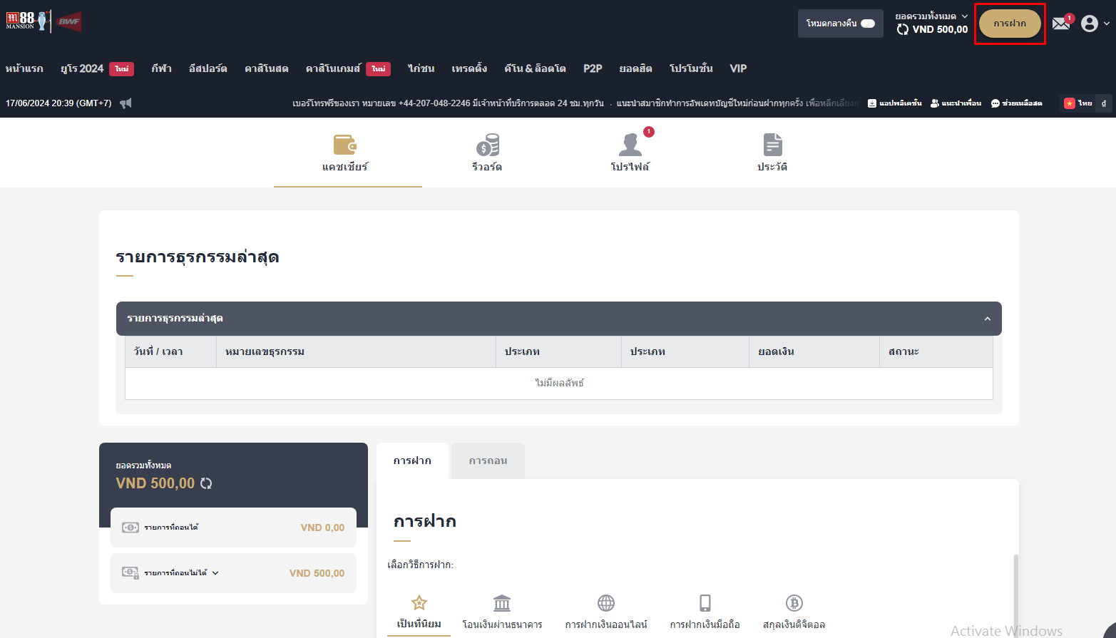 ขั้นตอนที่ 2: คลิกปุ่ม “ฝากเงิน” ที่หน้าเว็บหลักของ M88