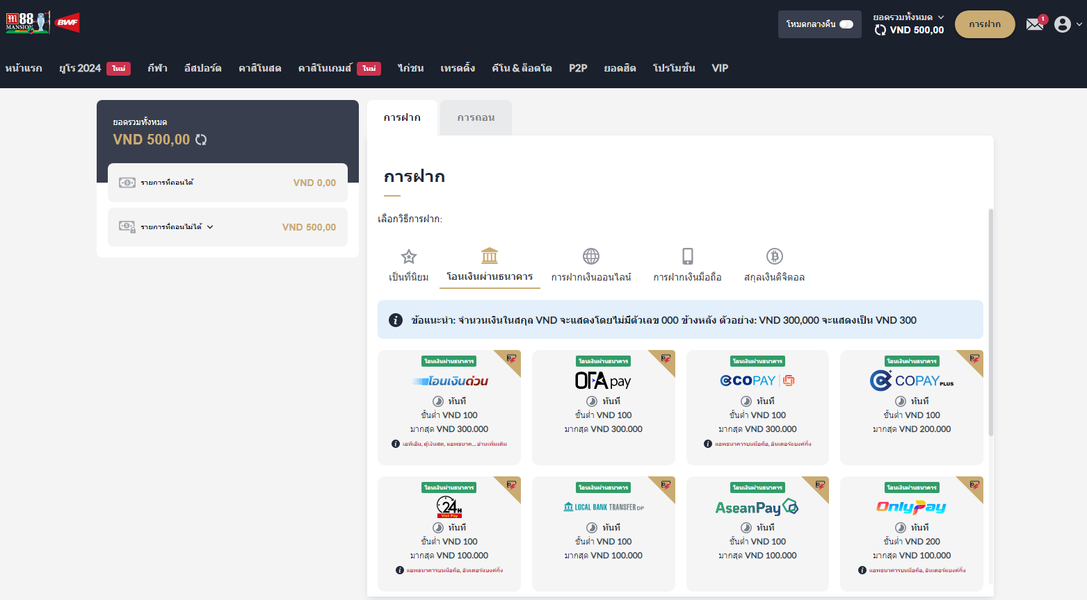 - ที่หน้าแรกของ M88: กรอกจำนวนเงินที่ต้องการฝากแล้วคลิก “ฝากเงิน” ในขั้นตอนนี้ให้คุณตัดเลขศูนย์สามตัวสุดท้ายออกจากจำนวนเงินที่ต้องการฝาก เช่น ถ้าคุณต้องการฝาก 2,000,000 ให้กรอก 2000