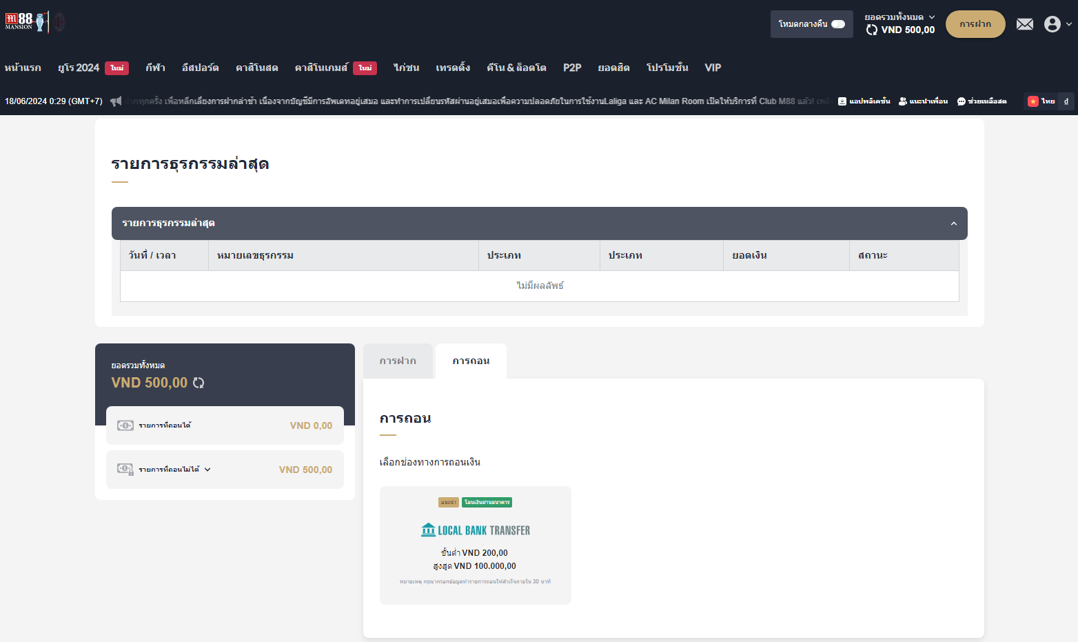 • สำหรับเงินที่ฝากเข้าบัญชี M88, ท่านต้องเดิมพันเงินนั้นอย่างน้อยหนึ่งครั้งก่อนที่จะสามารถถอนออกได้. โปรดทราบว่าหากเดิมพันนั้นเสมอ, เว็บพนันออนไลน์จะไม่นับเงินเดิมพันนั้น. นอกจากนี้, M88 จะหักค่าธรรมเนียมจากผู้เล่น. ตัวอย่างเช่น: หากท่านฝากเงิน 3 ล้านบาทและเดิมพัน 2 ล้านบาทและชนะเพิ่ม 500,000 บาท. ในกรณีนี้, ท่านไม่สามารถถอนเงินทั้งหมด 3.5 ล้านบาทได้. ไม่เพียงแต่ M88, แต่การเล่นที่เว็บพนันออนไลน์ใด ๆ ท่านก็ต้องปฏิบัติตามกฎระเบียบการถอนเงิน.